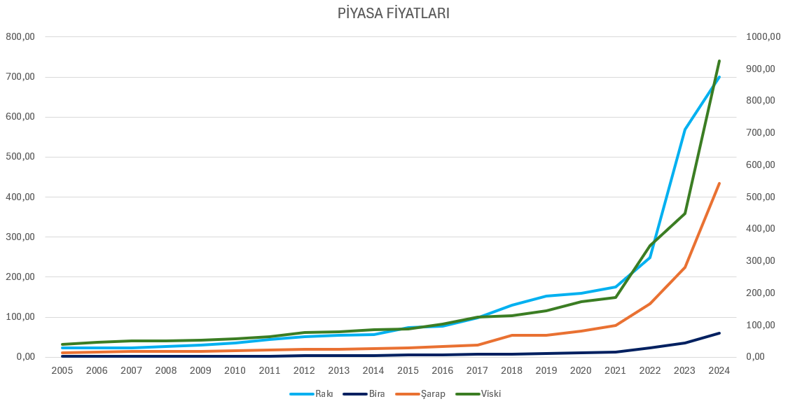 2005 yılından 2024’e rakı fiyatlarındaki yükseliş yüzde 3.011 oranında olurken, 2005 yılında 22,50 TL olan 70 cc’lik şişenin 2024 yılında ortalama 700 TL’ye satıldığı görülüyor. Aynı şekilde birada da 1,75 TL’den 60 TL’ye, şarapta 11,50 TL’den 435 TL’ye ve viskide de 40 TL’den 925 TL’ye bir yükseliş görülüyor.