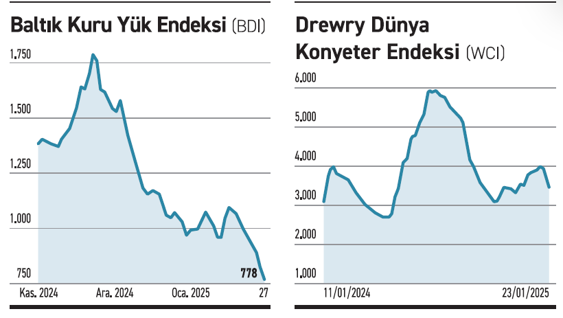 Fazlasının yapıldığı denizyolu taşımacılığında, öncü gösterge niteliğindeki navlun endeksleri sert düşüşe geçti. Baltık Kuru Yük Endeksi’nde son iki haftadaki düşüş yüzde 40’ı aştı. Yıla yükselişle başlayan Drewry Dünya Konteyner Endeksi’nde son iki haftadaki düşüş yüzde 15’e dayandı. Çin yeni yılı tatilinin yanı sıra küresel ekonomideki yavaşlama ve gemi arz-talep dengesizliği bu düşüşte etkili oldu. Denizcilik uzmanları, Gazze’deki ateşkesin ardından gemilerin Kızıldeniz’e geri dönme hazırlığında olduğunu, seyahat sürelerininin eskiye dönmesiyle navlunda daha büyük bir çöküş yaşanabileceği uyarısında bulundu.