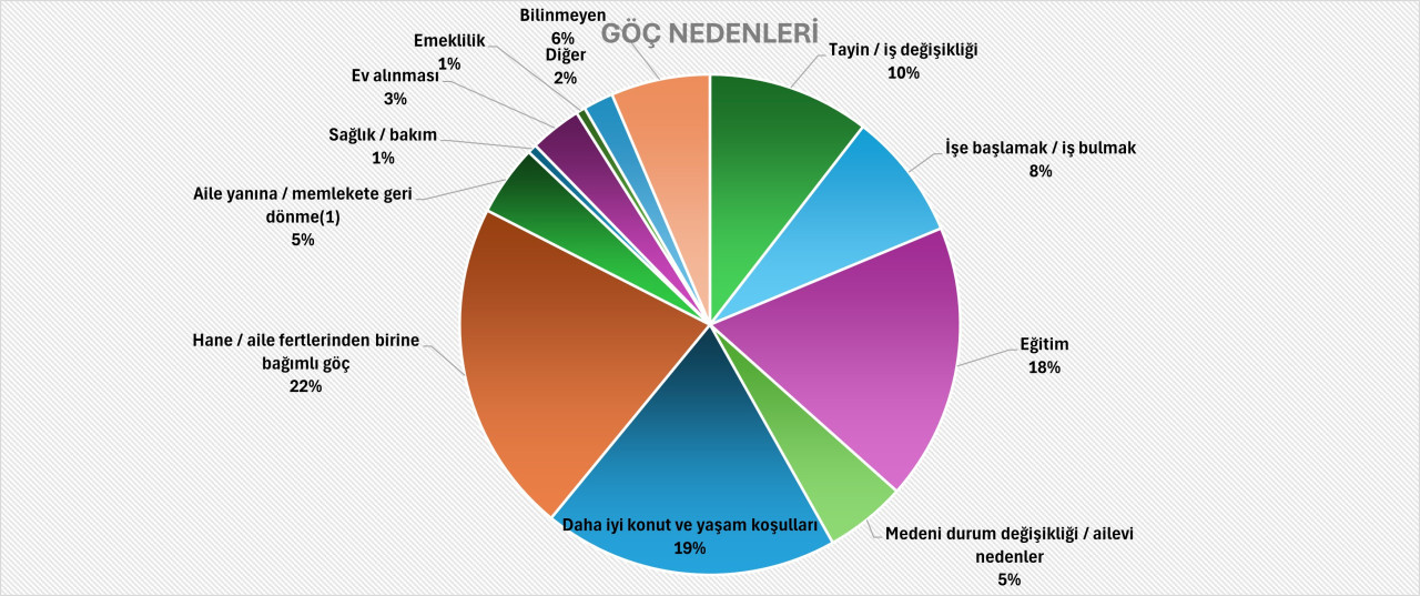 TÜİK’in açıkladığı 2024 iç göç verilerine göre, Türkiye'de insanlar en çok ailevi nedenlerle göç ederken, daha iyi yaşam koşulları ve ekonomik gerekçeler göçün ana itici güçleri olmaya devam etti. Gençler eğitim, yaşlılar ise konut ve yaşam kalitesi nedeniyle şehir değiştiriyor.
