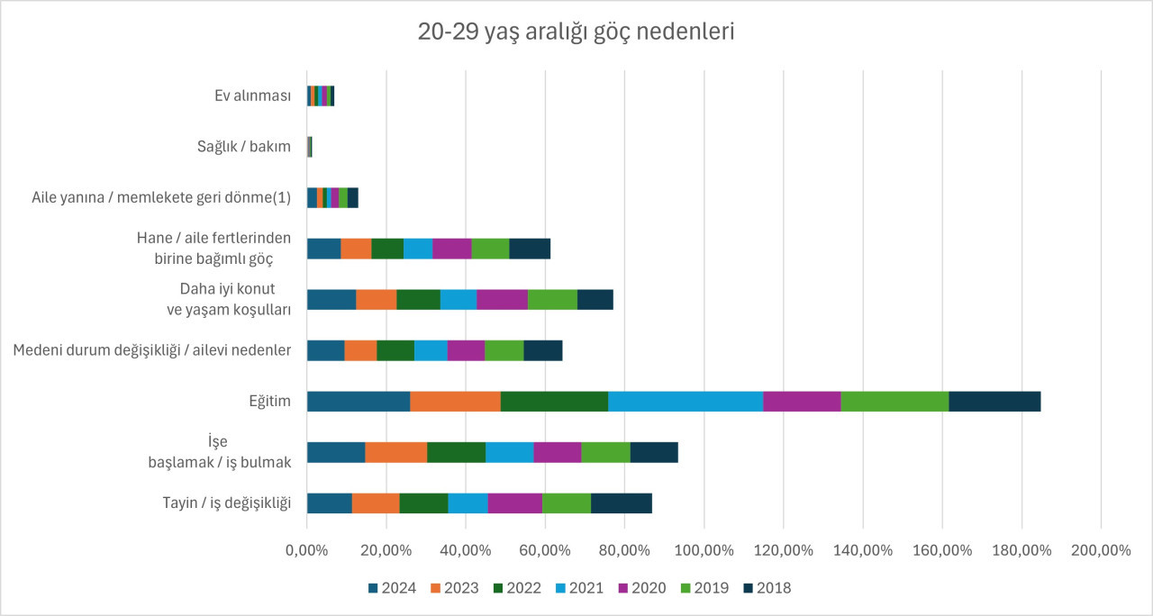 20-29 yaş aralığında gençlerin en büyük göç nedeni eğitim olurken, işe başlamak / iş bulmak ile daha iyi konut ve yaşam koşulları da onu izledi.