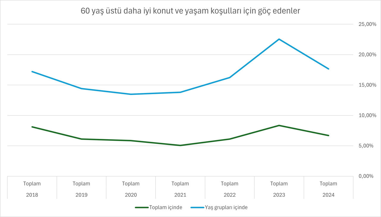 60 yaş üstü yurt içinde göç edenlerin içinde daha iyi konut ve yaşam koşulları arayanların yıllar içinde göç seyri de dikkat çekti.