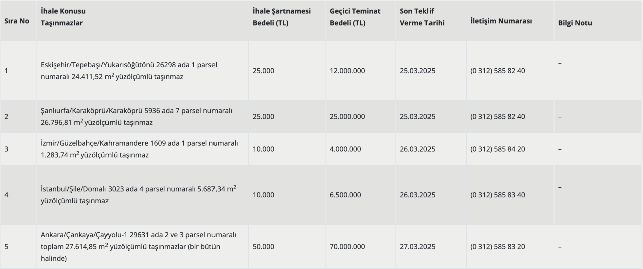 Bu taşınmazlar için ihale şartnamesi bedeli 10 bin ile 50 bin lira, geçici teminat bedeli ise 4 milyon ile 70 milyon lira arasında değişiyor.