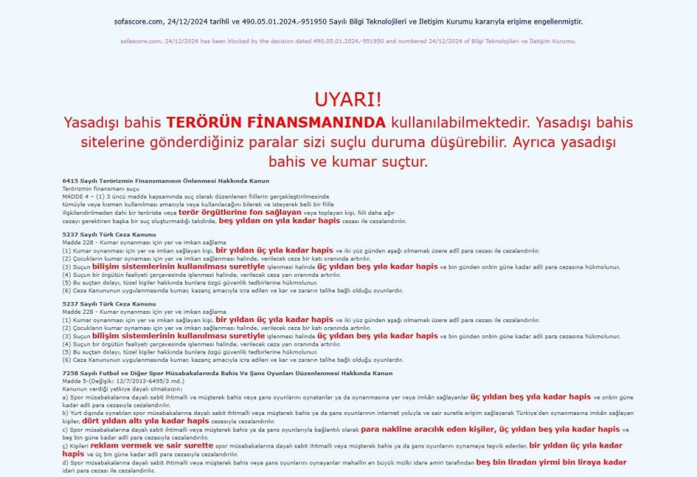 “Sofascore.com” adresine ulaşmaya çalışıldığı zaman ise kullanıcılar BTK tarafından erişim engeli getirildiğini ve “Uyarı! Yasadışı bahis terörün finansmanında kullanılabilmektedir. Yasadışı bahis sitelerine gönderdiğiniz paralar sizi suçlu duruma düşürebilir. Ayrıca yasadışı bahis ve kumar suçtur” metni ve yasadışı bahis ve kumar hakkında kanunlar ile karşılaşıyor.
