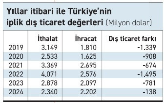 İhracat artarken ithalatta ise tam tersin yönde yüksek oranlı düşüşler görüldü. Salgın öncesi yıl olan 2019’da 3 milyar 149 milyon dolar olan ithalat değeri 2020’de 2 milyar 533 milyon dolara, 2021’de 3 milyar 369 milyon dolara, 2022’de 4 milyar 71 milyon dolara yükseldi. İzleyen yıllarda hızlı bir düşüş grafiği çizen ithalat, 2023’te 2 milyar 878 milyon dolara ve geçen yılın tamamında ise 2 milyar 340 milyon dolara düştü. gelişmelere paralel olarak Türkiye, dünya ithalat sıralamasında 2’ncilikten 3’üncülüğe düştü.