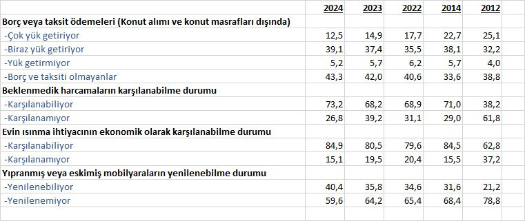 Fertlerin yüzde 57,5'i evden uzakta bir haftalık tatil masraflarını, yüzde 26,8'i beklenmedik harcamaları, yüzde 15,1'i evin ısınma ihtiyacını, yüzde 59,6'sı ise eskimiş mobilyaların yenilenmesini ekonomik olarak karşılayamadığını bildirdi.
