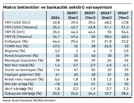ÜNLÜ&Co araştırmacıları bankacılık raporlarında 2025 ve 2026 yılı için kar tahminlerini bir önceki rapora göre sırasıyla yüzde 7 ve yüzde 11 aşağı yönlü revize ettiğini belirtirken net kar artışıyla ilgili daha temkinli yaklaşımlarının faaliyet giderlerinde yukarı yönlü baskıları, aktif kalitesindeki süregelen seyiri ve makro varsayımlardaki güncellemeleri yansıttığını vurguladı.