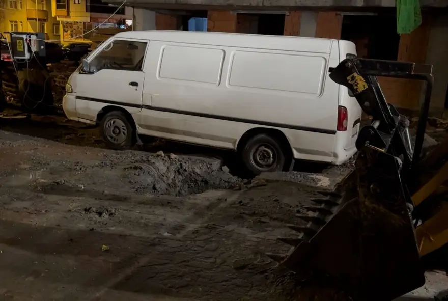 Çöken yolda sıkışan araç cep telefonu kamerası ile görüntülendi.