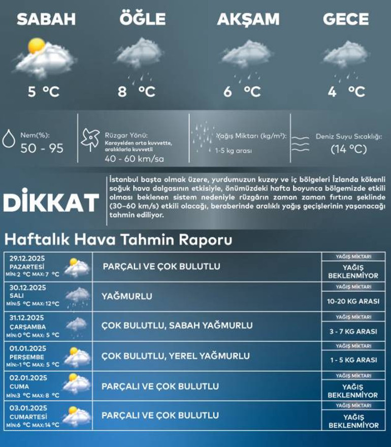 İstanbul başta olmak üzere, yurdumuzun kuzey ve iç bölgeleri İzlanda kökenli soğuk hava dalgasının etkisiyle, önümüzdeki hafta boyunca bölgemizde etkili olması beklenen sistem nedeniyle rüzgârın zaman zaman fırtına şeklinde (30-60 km/s) etkili olacağı, beraberinde aralıklı yağış geçişlerinin yaşanacağı tahmin ediliyor.
