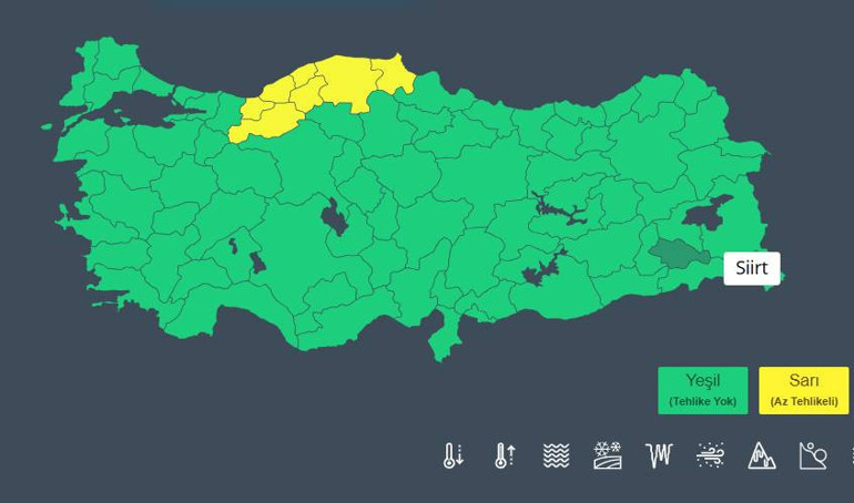Meteoroloji Genel Müdürlüğü 7 il için sarı kodlu alarm verdi. O iller sırasıyla Bolu, Kastamonu, Sinop, Zonguldak, Bartın, Karabük, Düzce oldu.