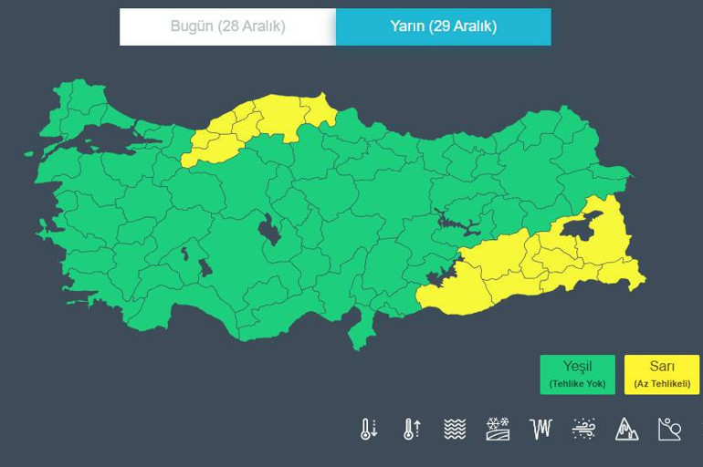Meteoroloji Genel Müdürlüğü yarın için ise 16 ili sarı kodla uyardı. Bu iller de şu şekilde sıralandı: Bitlis, Bolu, Diyarbakır, Hakkari, Kastamonu, Mardin, Siirt, Sinop, Şanlıurfa, Van, Zonguldak, Batman, Şırnak, Bartın, Karabük, Düzce