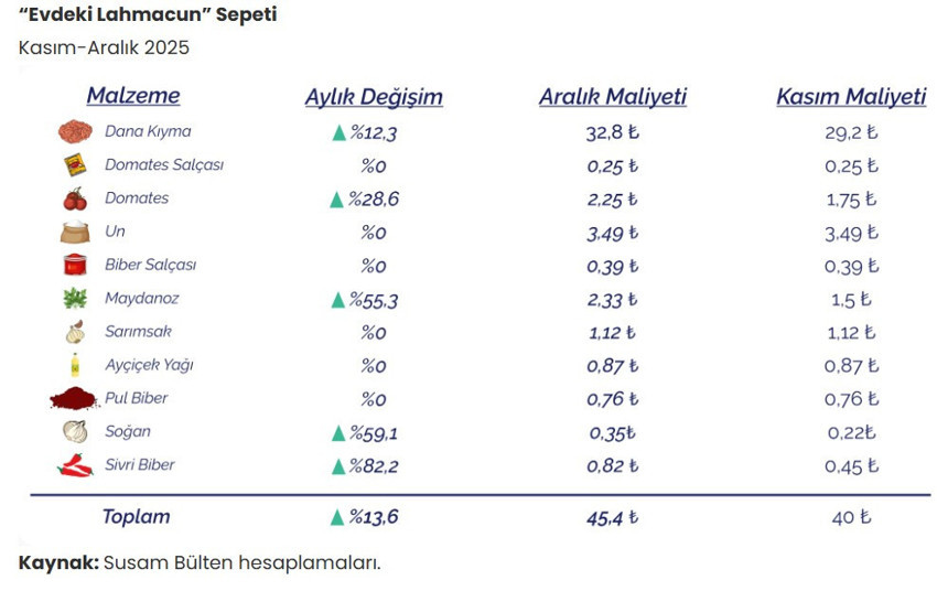 Kasım ayında maliyeti 40 TL olan tek porsiyon ev yapımı lahmacun, aralıkta 45,4 TL’ye çıktı. Evde yapılan lahmacunun maliyeti aylık yüzde 13,6 arttı.