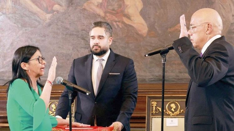 Delcy Rodriguez törende Nicolas Maduro’nun oğlu Nicolas Maduro Guerra’nın tuttuğu anayasaya el basarak ağabeyi olan Ulusal Meclis Başkanı Jorge Rodriguez’in önünde yemin ederek göreve başladı.